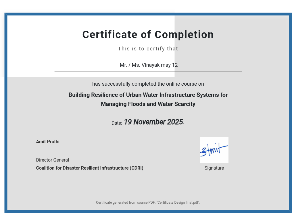 This course aims to build capacity to address the growing challenges of climate- and disaster-induced risks to urban water infrastructure. It has been developed by CDRI in collaboration with Deltares, and with the support of the Ministry of Infrastructure and Water Management, Government of the Netherlands.