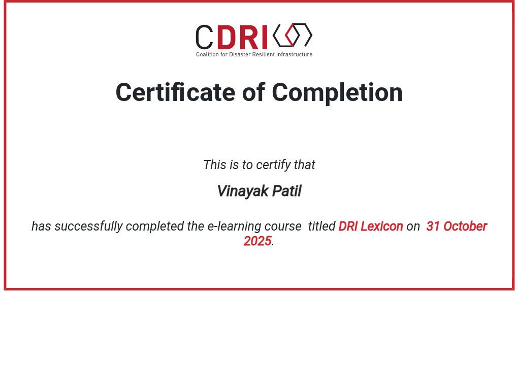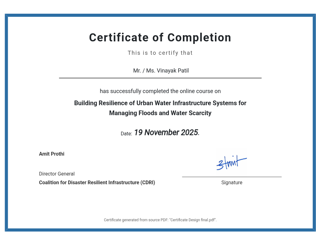 Vinayak Patil enroll for the courseEditingThis course aims to build capacity to address the growing challenges of climate- and disaster-induced risks to urban water infrastructure. It has been developed by CDRI in collaboration with Deltares, and with the support of the Ministry of Infrastructure and Water Management, Government of the Netherlands.Post is under moderationStream item published successfully. Item will now be visible on your stream.