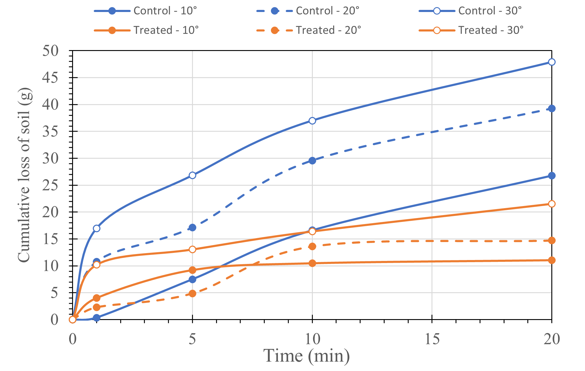 Cumulative loss of soil over time for bio-stimulated treated and control samples.